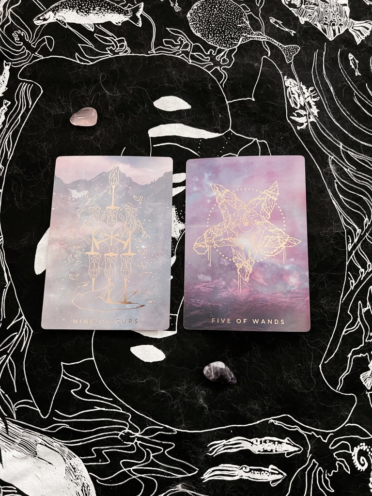 Nine of cups represents pleasure, contentment, and success and Five of Wands is competition and conflict. Neither cards surprised me as we are celebrating and grateful for each other. And what to watch for; I already have my eyes peeled for what’s to come.